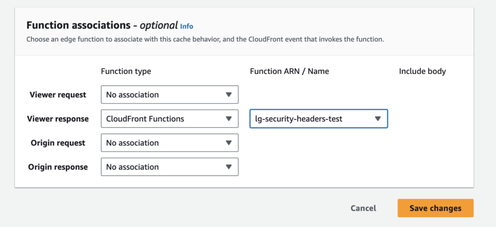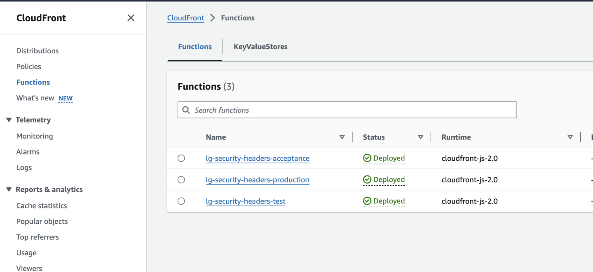 Here you can see it is a Cloudfront Function changing your headers, and as such we will have to edit it. - Navigate back to Cloudfront > Functions