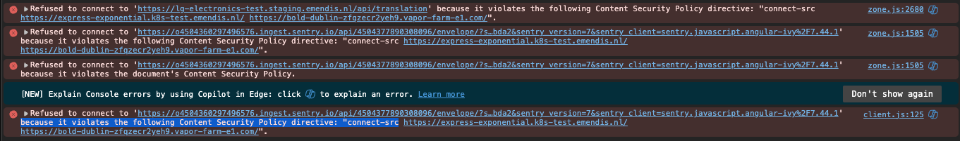 On cloudfront, it is possible to let cloudfront itself add security headers to prevent connections to unpredicted URLS, which casuses the following error: